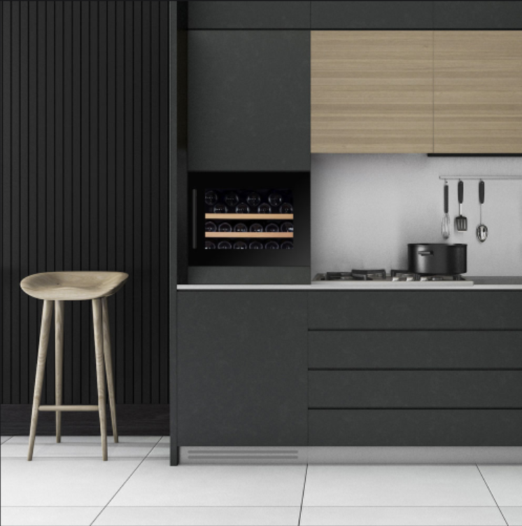 Matt musta klaasuksega ja musta käepidemega integreeritav veinikülmik sobib ideaalselt modernsesse kööki.