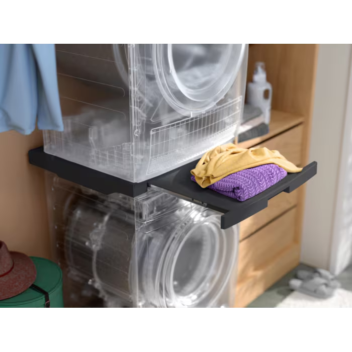Kuivati paigutamine pesumasina peale on suurepärane viis pesuruumi avaramaks muutmiseks. Kinnituskomplekt annab teile stabiilse võimaluse kuivati paigutamiseks pesumasina peale. Väljatõmmatav riiul pakub teile rohkem võimalusi pesu sorteerimiseks või kokkupanekuks.