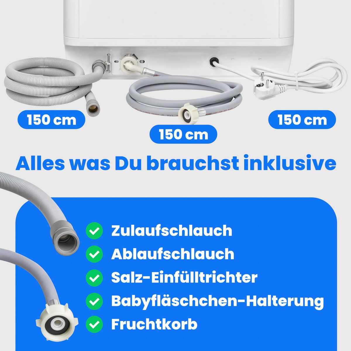 Komplektis sisse- ja äravooluvoolik, soola täitelehter
