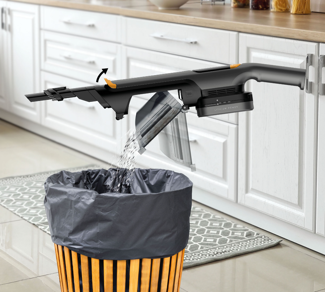 Tolmumahuti avatakse lihtsalt ühe käeliigutusega. See muudab mustuse tühjendamise kiireks ja hügieeniliseks.